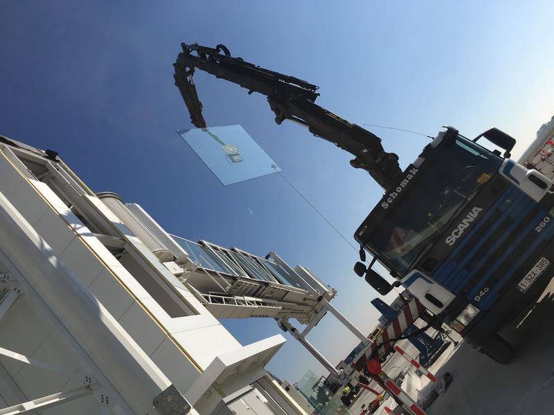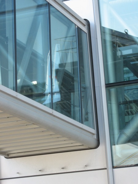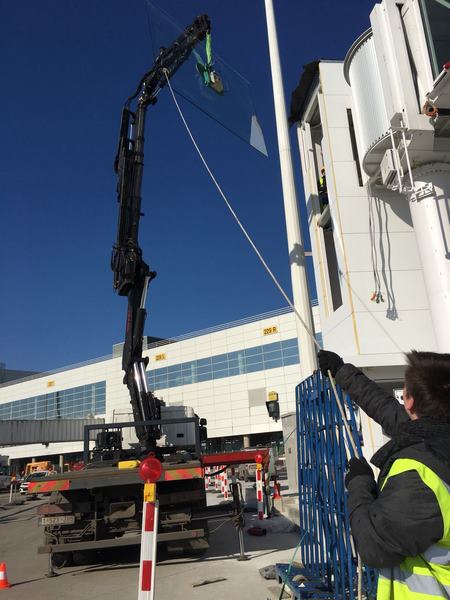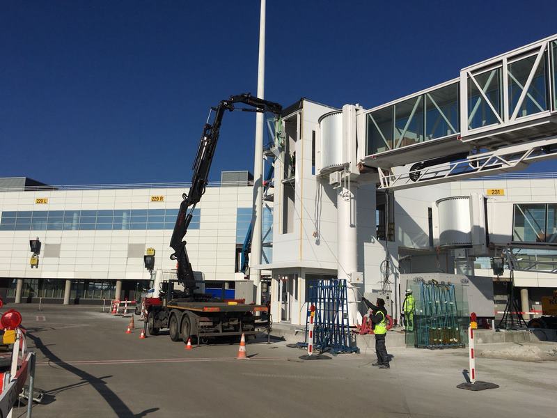 Passerelles d'embarquement :insertion en facade ;mise en place vitrages couloir par l'exterieur