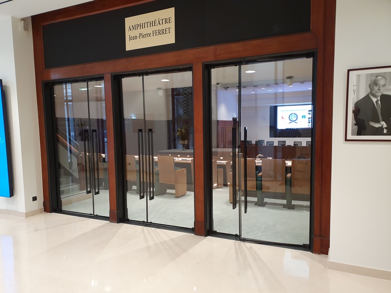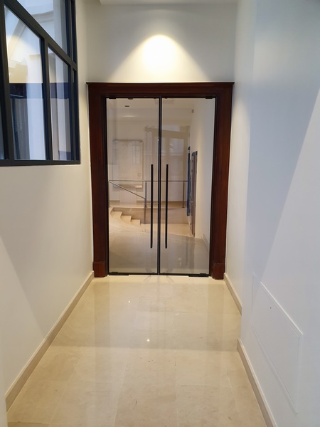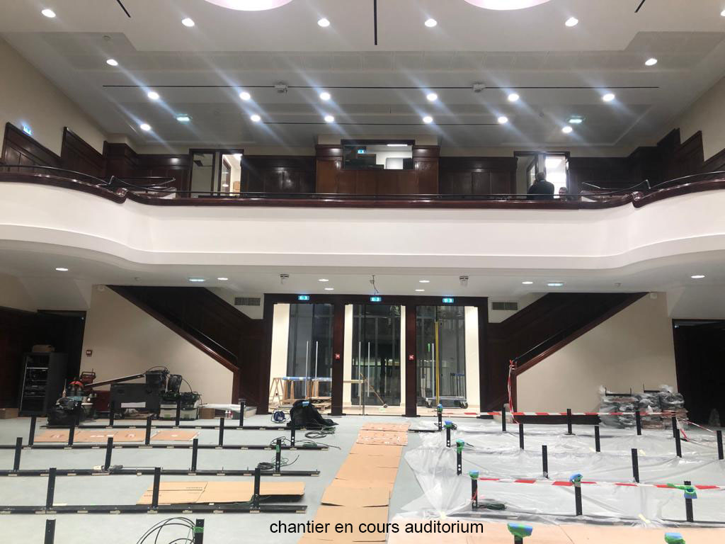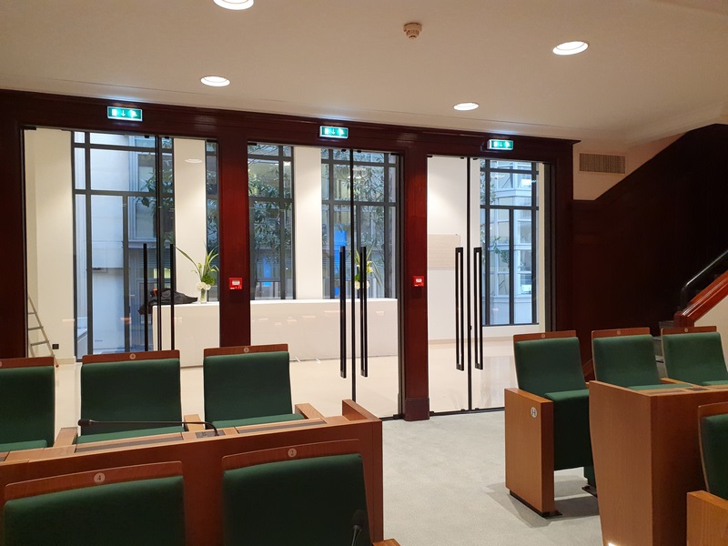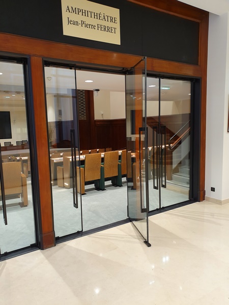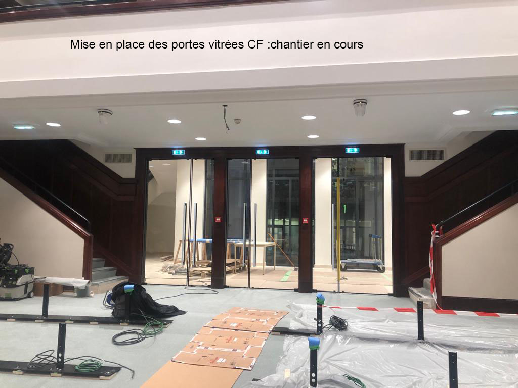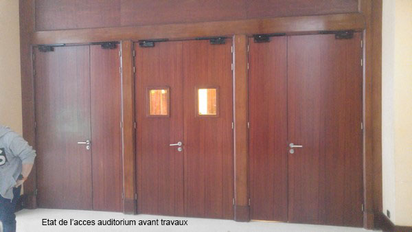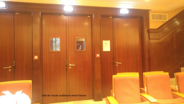 Immeuble Classé en RdC Amphithéatre du Conseil : ensemble coupe feu verre dans huisserie bois