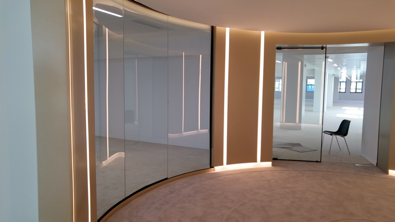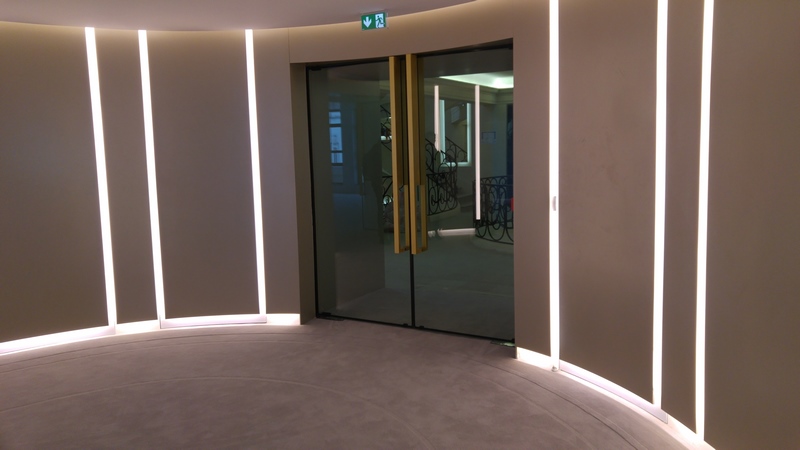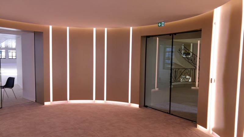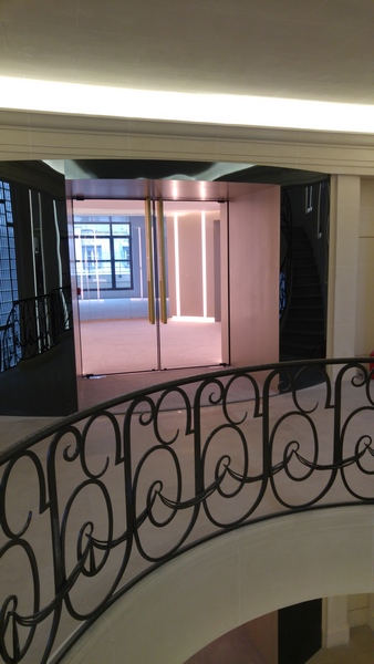 Hall et escalier classé : acces coupe feu sur le hall et les étages bureaux CF finition laitonnée et poignées sur mesure