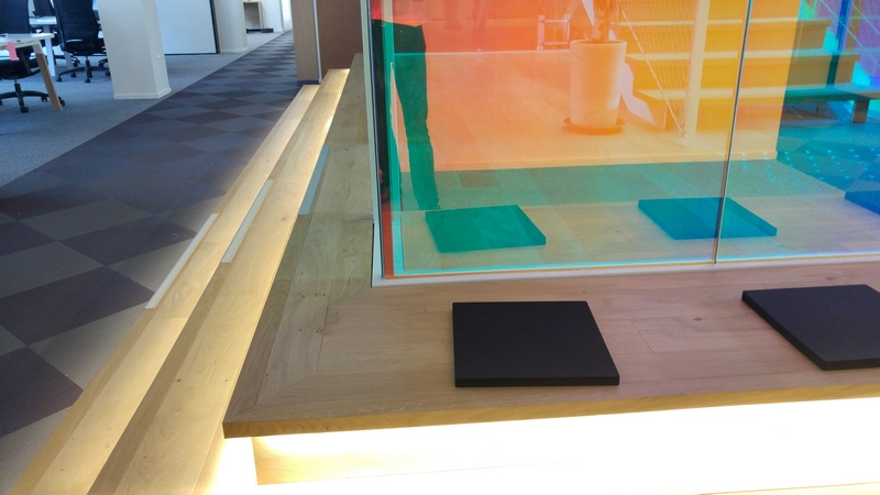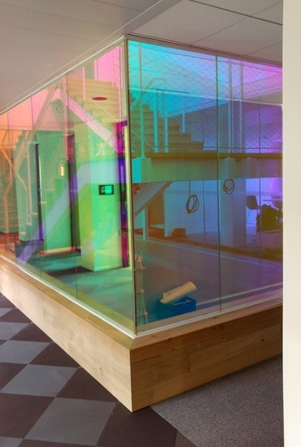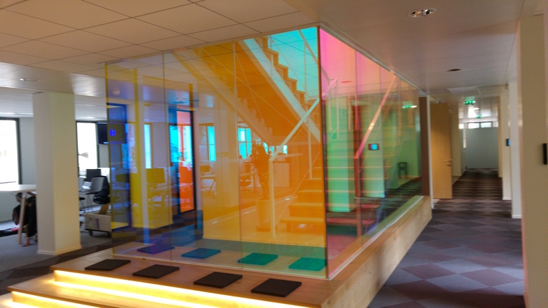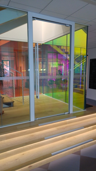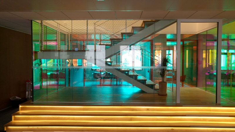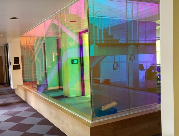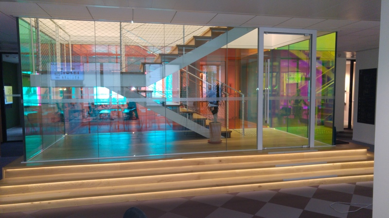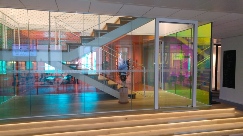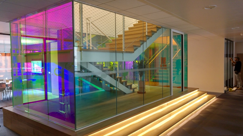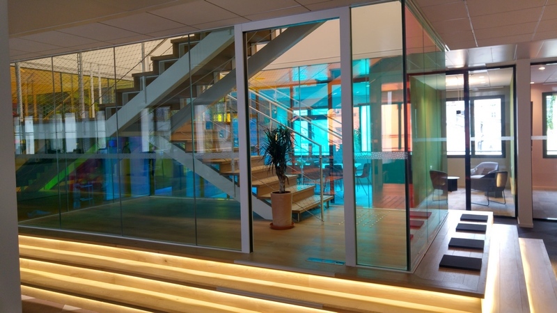 Hall escalier central en verre CoupeFeu films irisés du siège Uber France